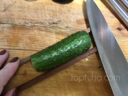 Укладываем по бокам палочки для еды и нарезаем поперёк.