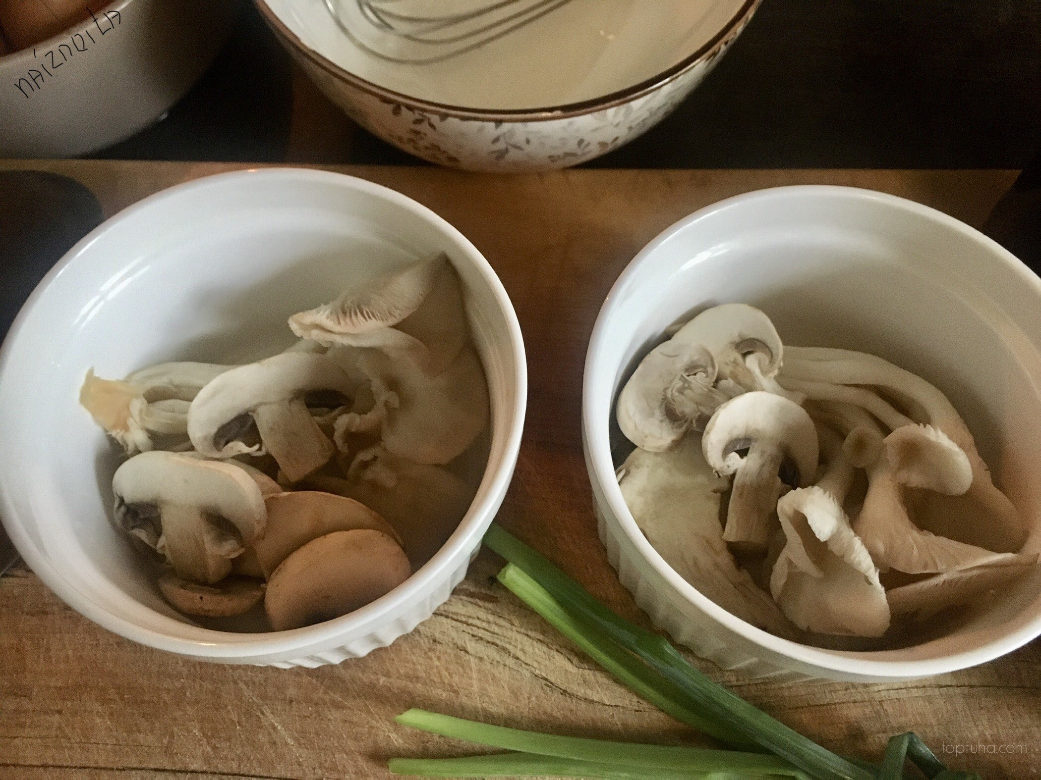 Первым делом произвольно кромсаем грибы и раскладываем по пиалушкам.