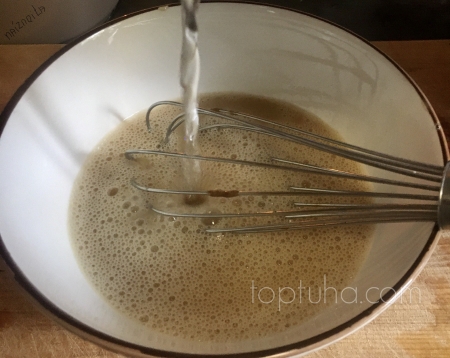 Точное количество миллилитров не подскажу, примерно полстакана воды и столовая ложка соуса. Перемешиваем и вливаем в грибы.
